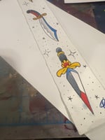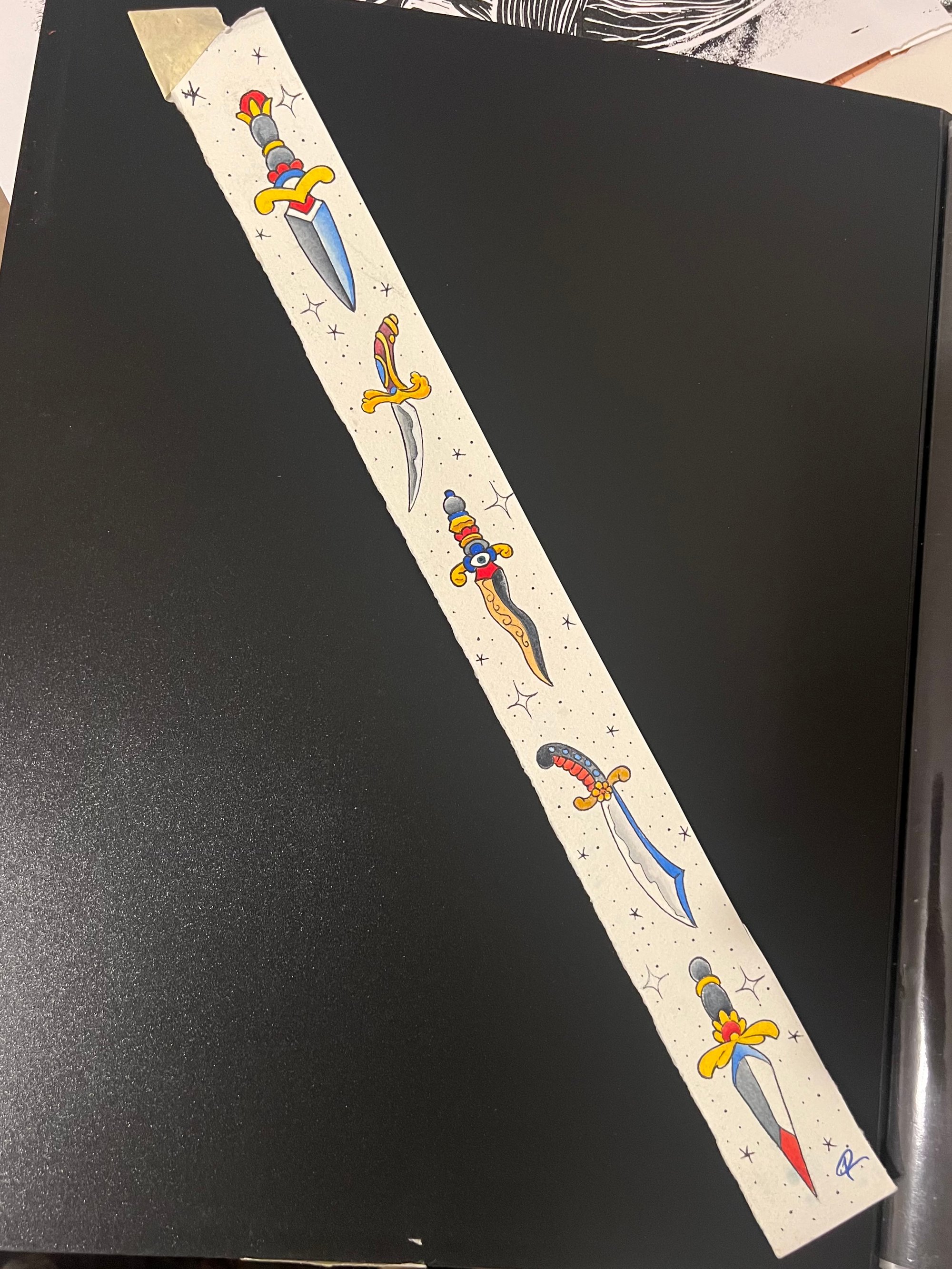 This is what started the Secret Stabs...sitting at my table not wanting to start a new project so i picked up a scrap of paper i had trimmed off of a bigger piece and started doodling little daggers.... lots of scraps later and you can buy little blind bags of tiny knife paintings....